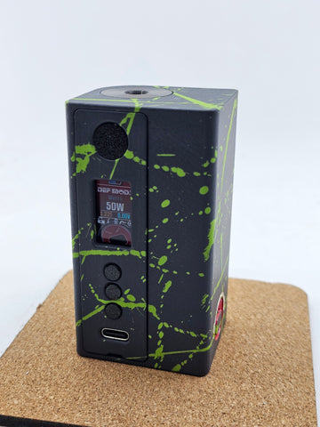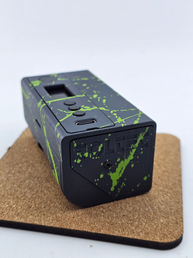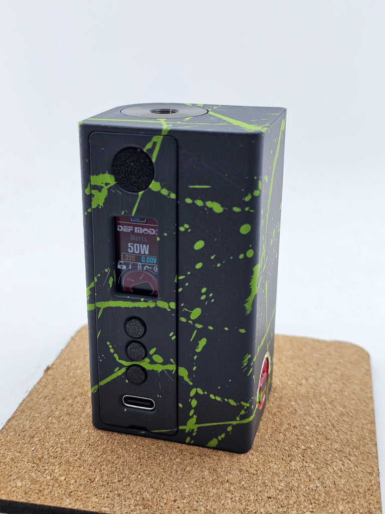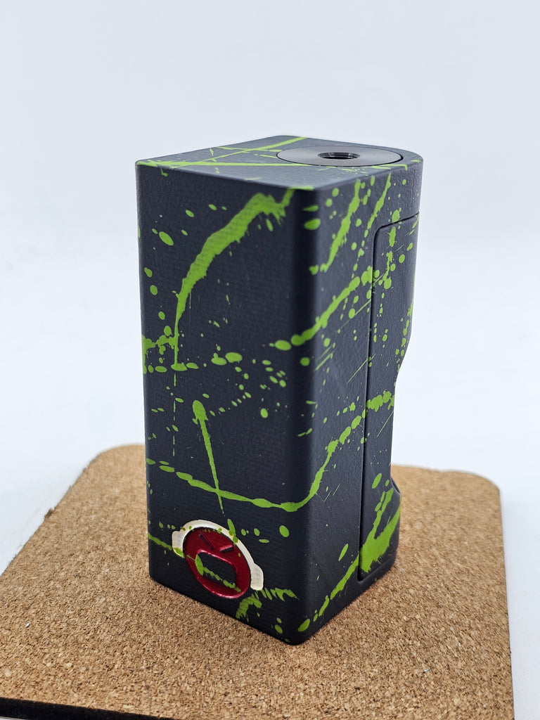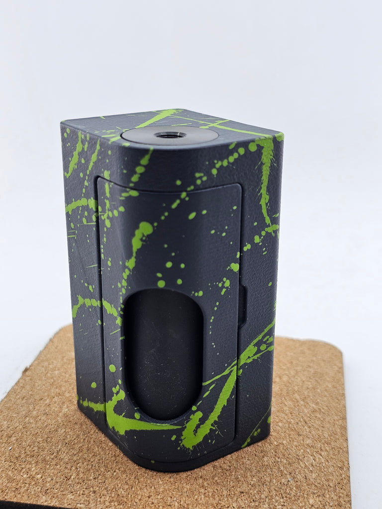 100w with 4500 para lipo config. Great battery life. Large 10ml squonk bottle. Can fit up to 28mm no overhang.